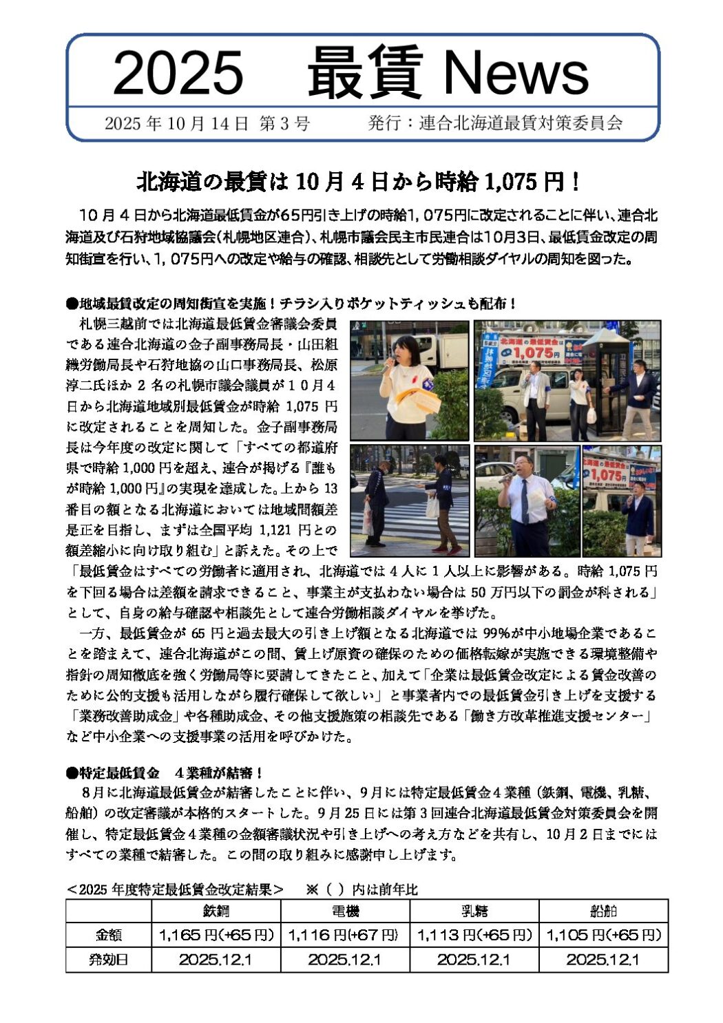 10月4日から北海道最低賃金が65円引き上げの時給1,075円に改定されることに伴い、連合北海道および連合石狩地域協議会(札幌地区連合)、札幌市議会民主市民連合は10月3日、最低賃金改定の周知街宣を行い、1,075円への金額改定や給与の確認、相談先として労働相談ダイヤルの周知を図りました。