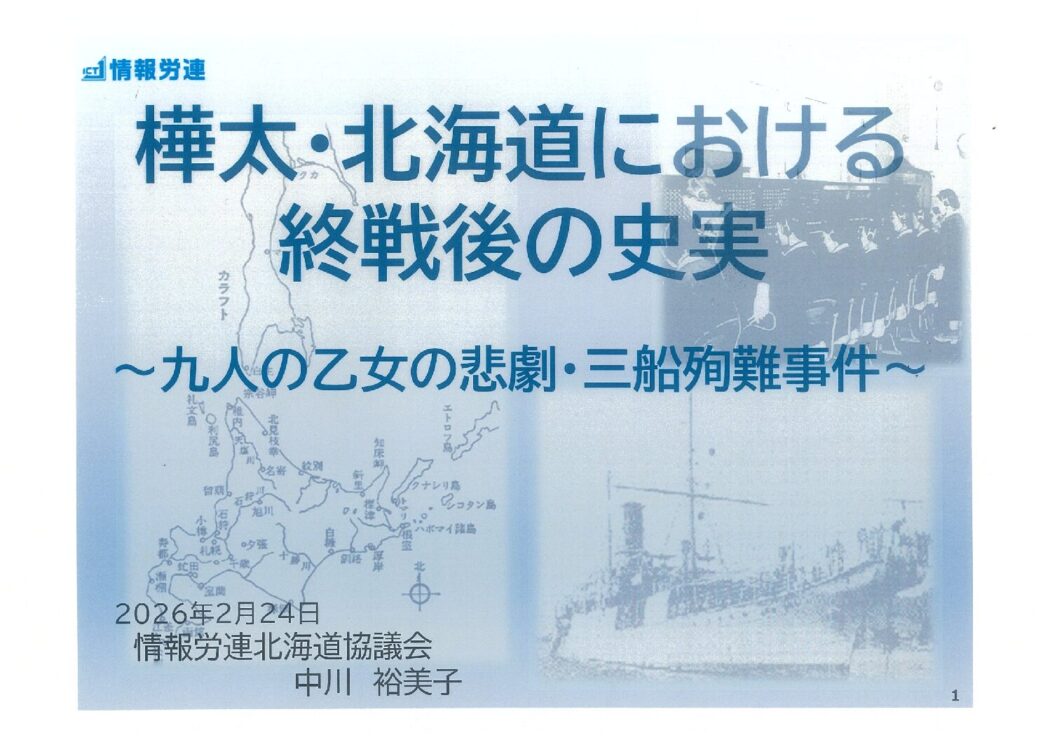 札幌地区連合は2月24日、3年ぶりとなる「なるほどセミナー」を開催し、全体で90名(内青年25名)が参加しました。情報労連北海道協議会事務局次長の中川裕美子さんを講師にお迎えし、「樺太・北海道における終戦後の史実~九人の乙女の悲劇・三船殉難事件~」と題し講演いただきました。