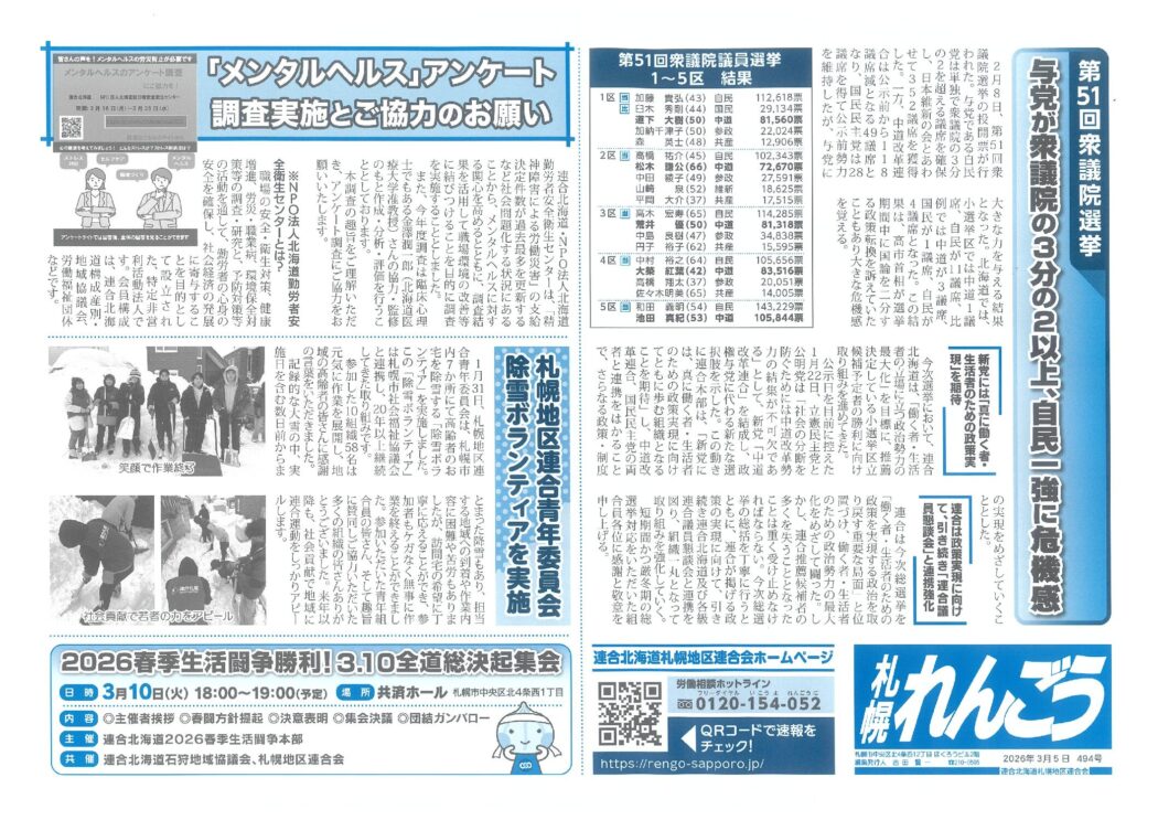 れんごう札幌 2026年3月5日 494号を発行しました。